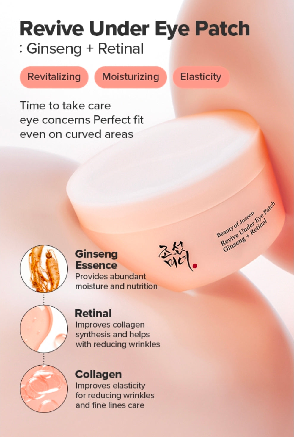 Beauty of Joseon Revive Under Eye Patch Retinal Ginseng para bolsas hinchadas debajo de los ojos Mascarillas de colágeno y péptidos.