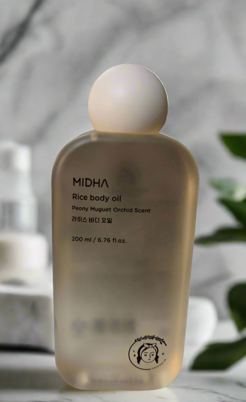Aceite corporal de arroz MIDHA con aroma a peonía, muguet y orquídea: hidrata profundamente y protege la piel.