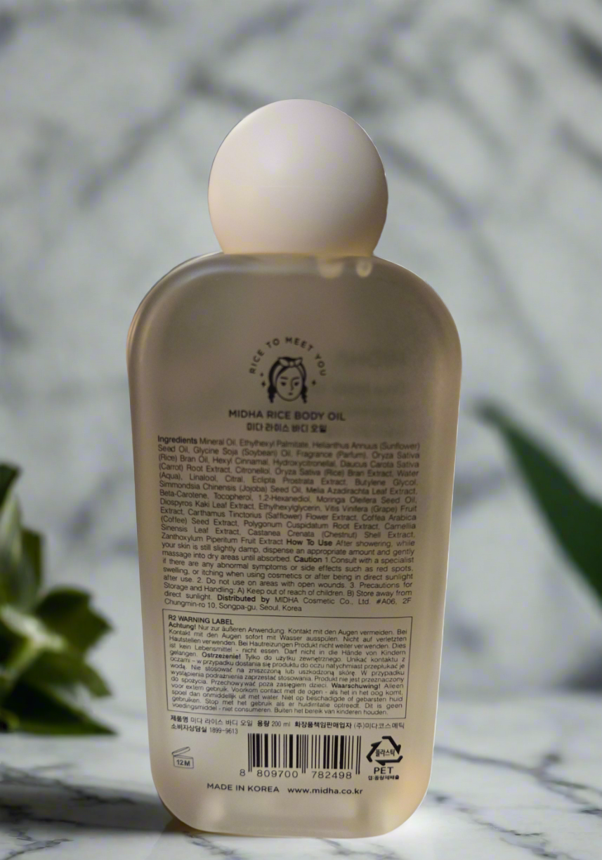 - Otros aceites naturales: Los productos Midha suelen combinar aceite de salvado de arroz con otros aceites nutritivos como el de oliva, soja, girasol y jojoba. Esto contribuye a una textura sedosa y no grasa, y asegura una rápida absorción del aceite, dejando la piel suave y tersa.