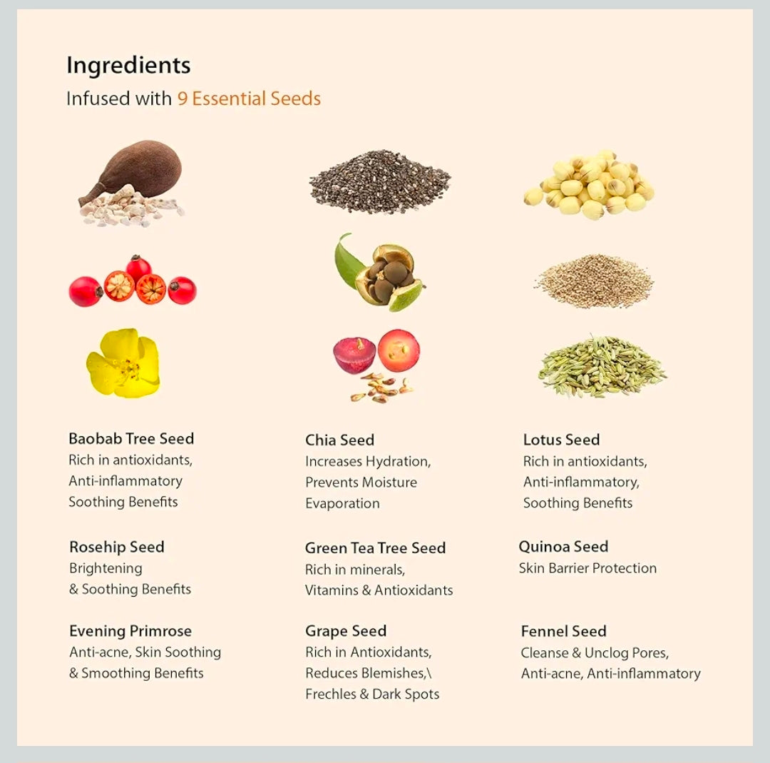This luxurious essence is packed with 9 essential seeds, all of which are natural and provide powerful skin-caring benefits. Baobab Tree, Chia, and Lotus seeds provide hydration, moisture, and Vitamin C, while Fennel and Rosehip seeds soothe and brighten.