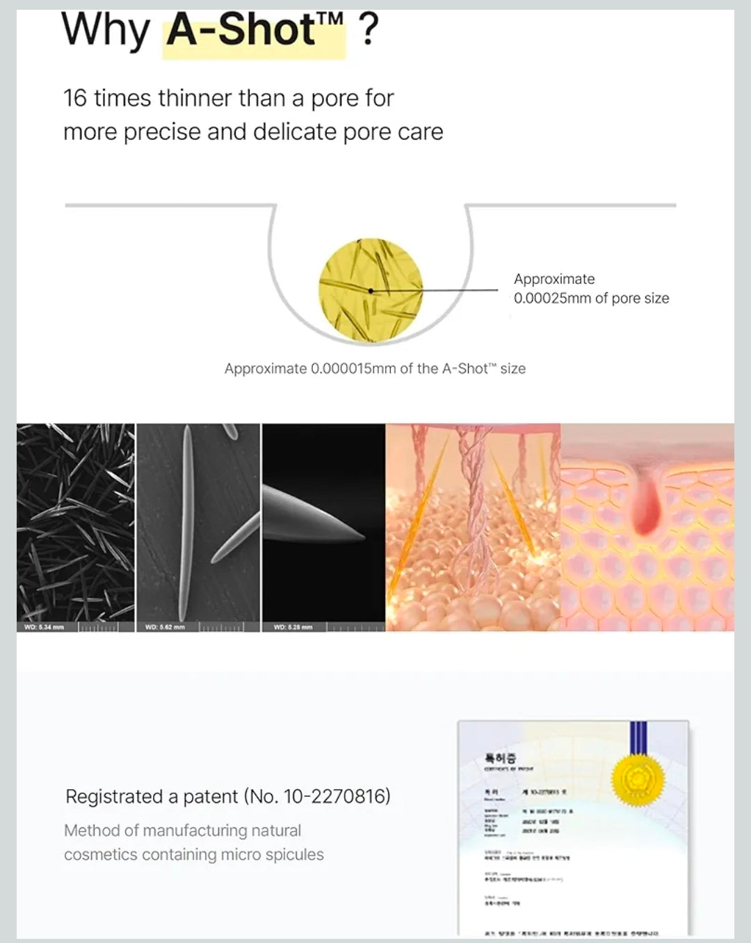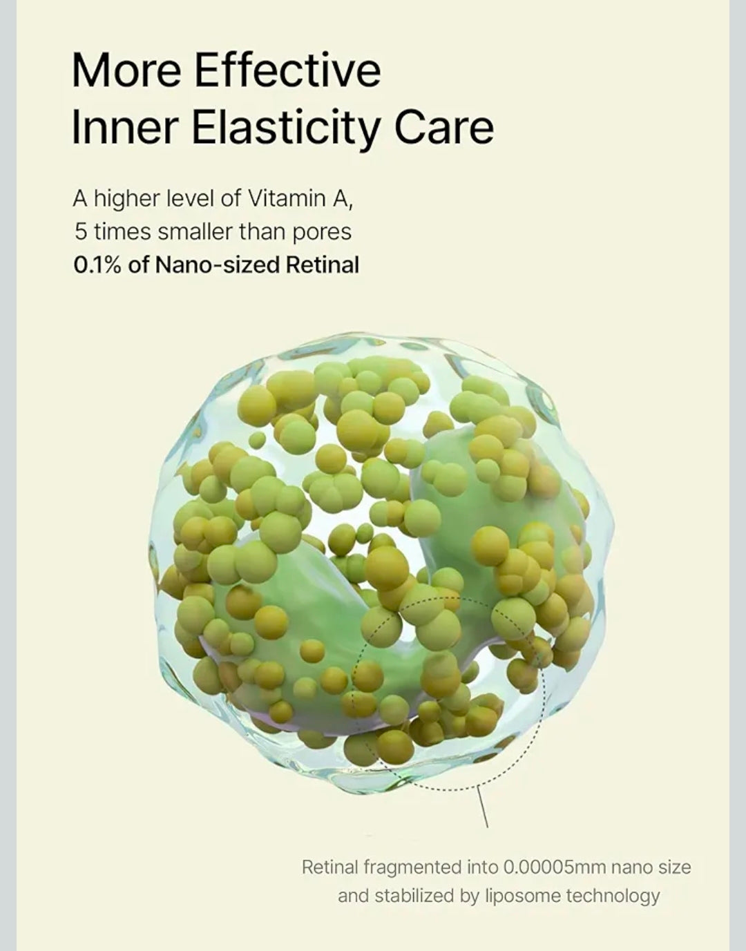 Infused with 0.1% retinal, the advanced form of retinol, combined with A-Shot, designed to directly penetrate pores and enhance absorption, delivers retinal deep into the skin to target wrinkles and enlarged pores, promoting smoother and firmer skin.