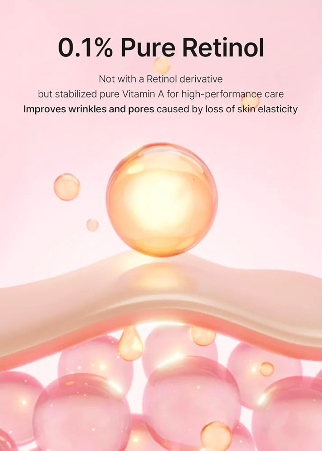 Pure Vitamin A retinol, not a retinol derivative, is a highly effective ingredient that excels at improving wrinkles and pores caused by loss of skin elasticity.