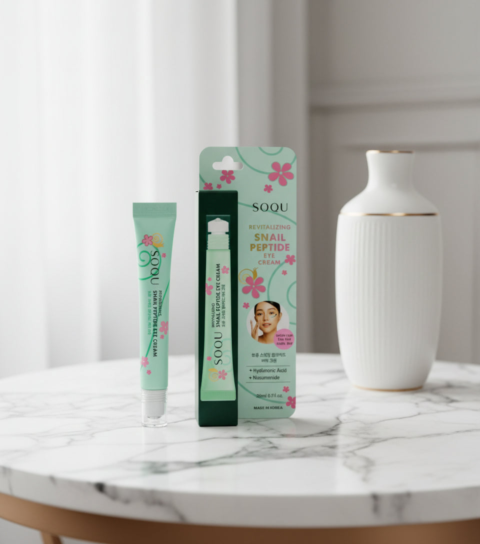 The SOQU Revitalizing Snail Peptide Eye Cream is part of a skincare line that focuses on the benefits of snail mucin and peptides.