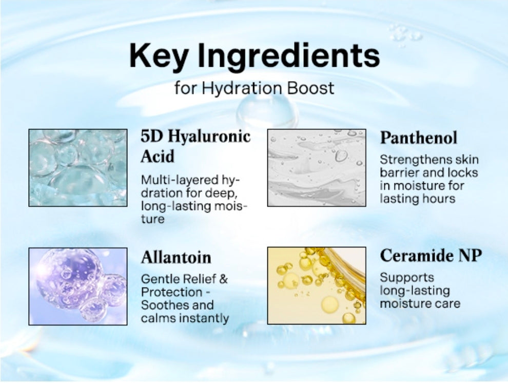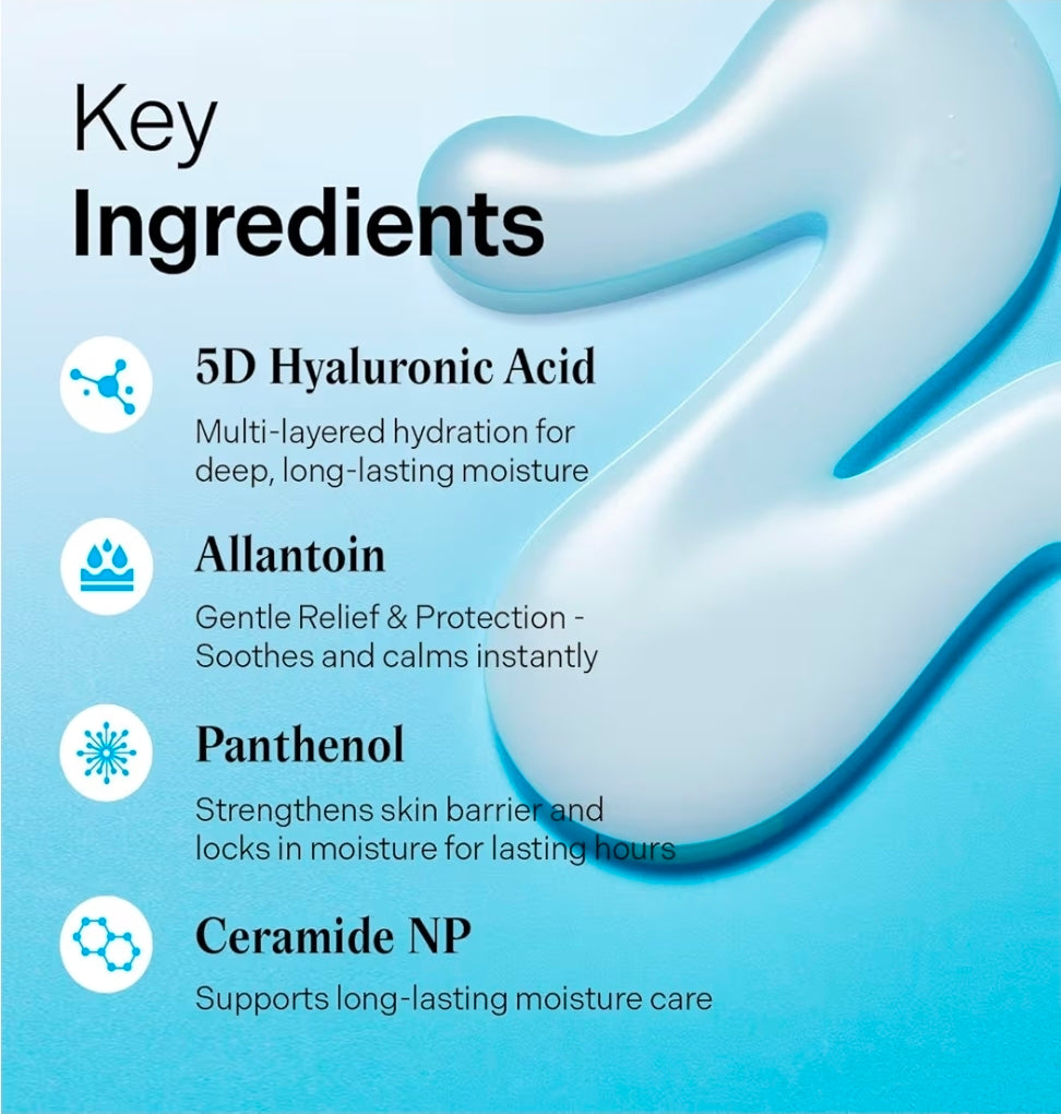 5D HYALURONIC ACID COMPLEX FOR DEEP HYDRATION : Formulated with 5 types of high, mid and low molecular weight Hyaluronic Acid, this unique 5D complex structure builds 3D networks within the skin layers to deliver moisture deeply and evenly across multiple layers, leaving your skin deeply hydrated and plump.